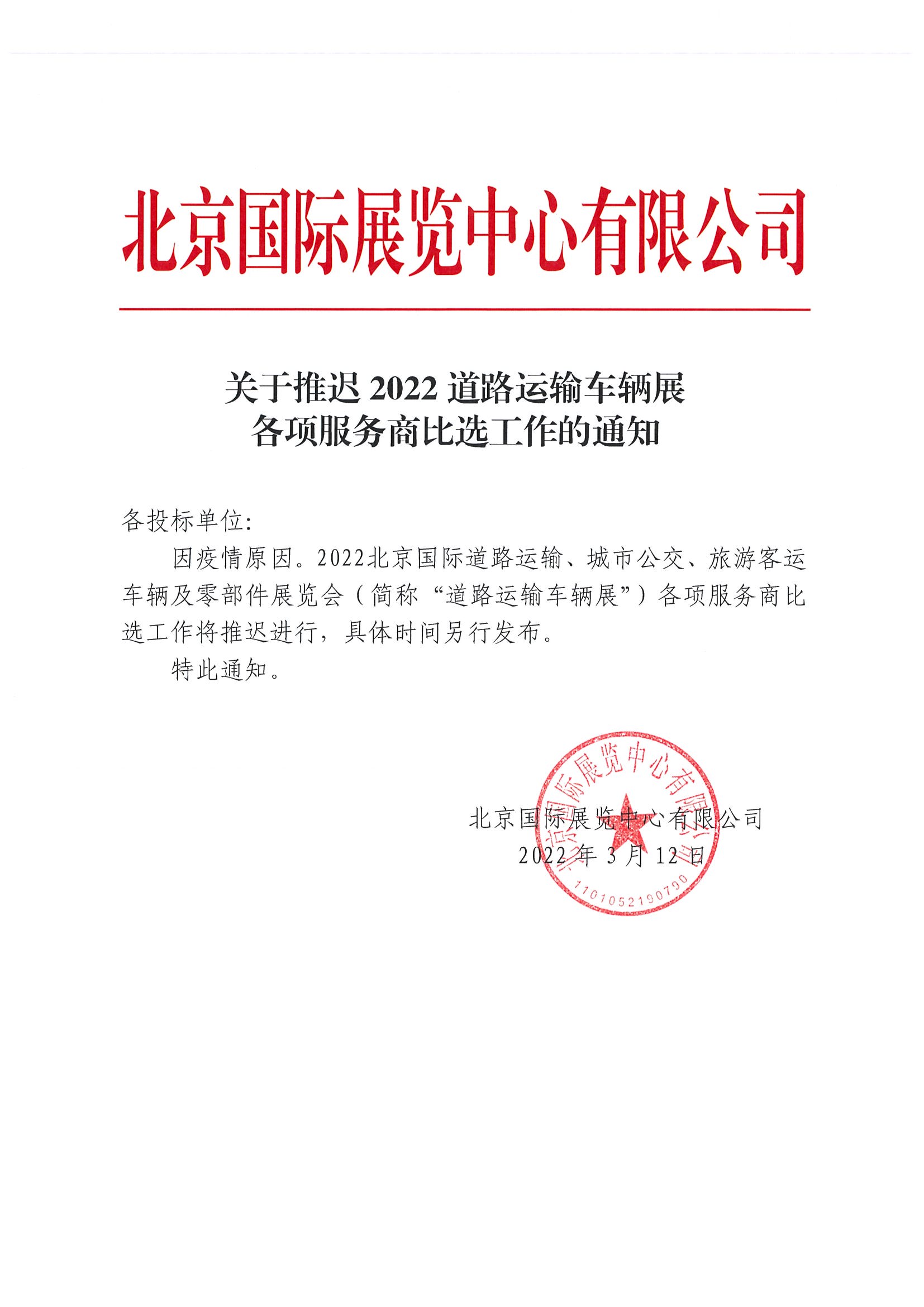 關(guān)于推遲2022道路運(yùn)輸車(chē)輛展各項(xiàng)服務(wù)商比選工作的通知