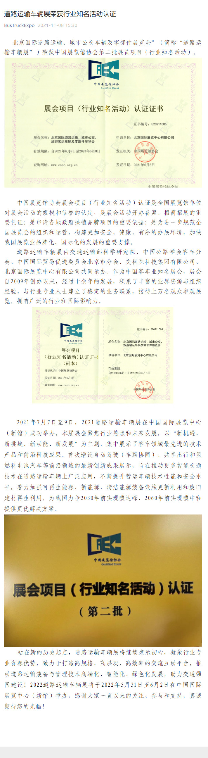 道路運輸車輛展榮獲行業(yè)知名活動認(rèn)證