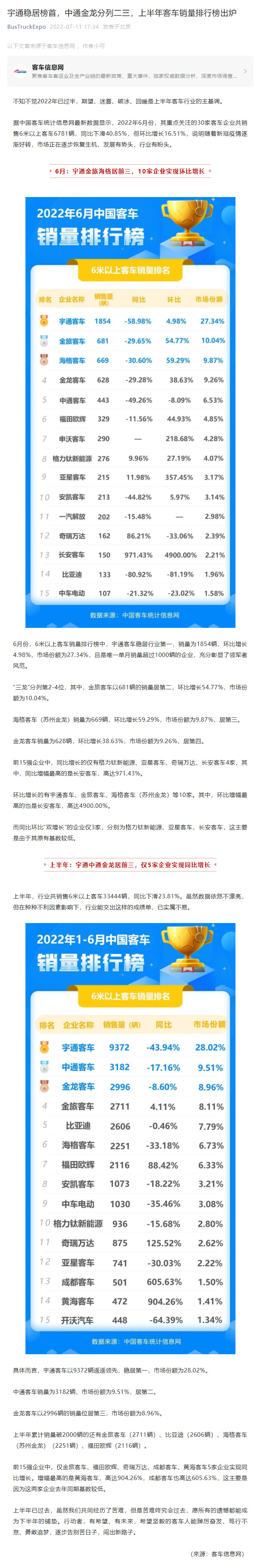 宇通穩(wěn)居榜首,中通金龍分列二三,上半年客車銷量排行榜出爐