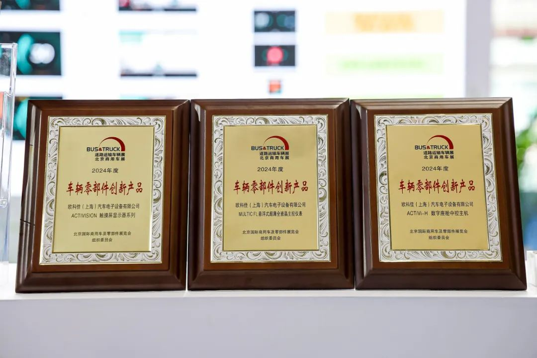 其中,歐科佳新品——MULTIC FL懸浮式超薄全液晶主控儀表和ACTIVISION觸摸屏顯示器系列,與ACTIVI數(shù)字座艙主機(jī)還在展會(huì)中脫穎而出,共同榮獲了“2024年道路運(yùn)輸車輛展車輛零部件創(chuàng)新產(chǎn)品”獎(jiǎng)項(xiàng),歐科佳技術(shù)實(shí)力和產(chǎn)品創(chuàng)新能力再次得到認(rèn)可。
